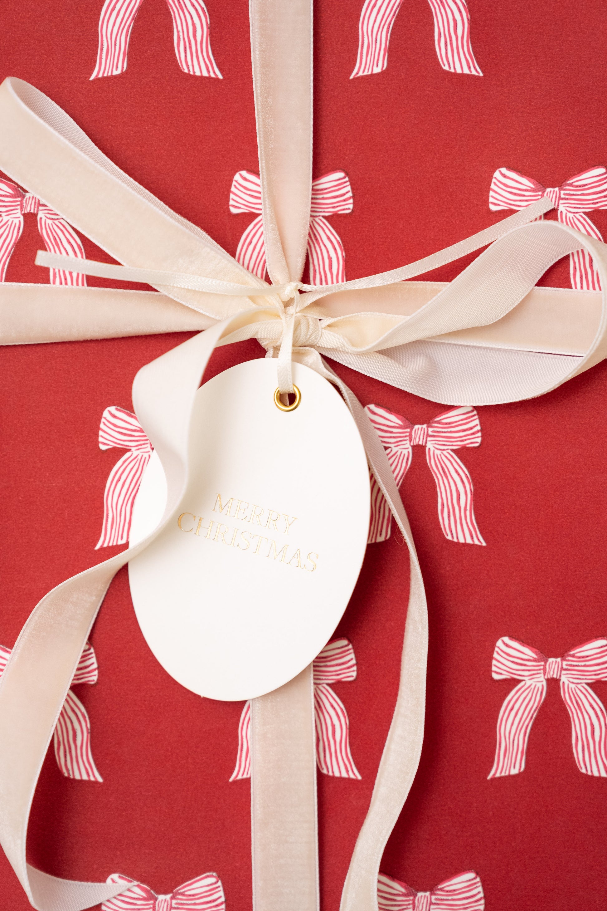 Tags: Set of 25 oval letterpress tags with gold foil and gold grommet. "Merry Christmas" is printed on the front and "to/with love" is printed on the back. Includes coordinating cream satin ribbon for attaching to gifts.