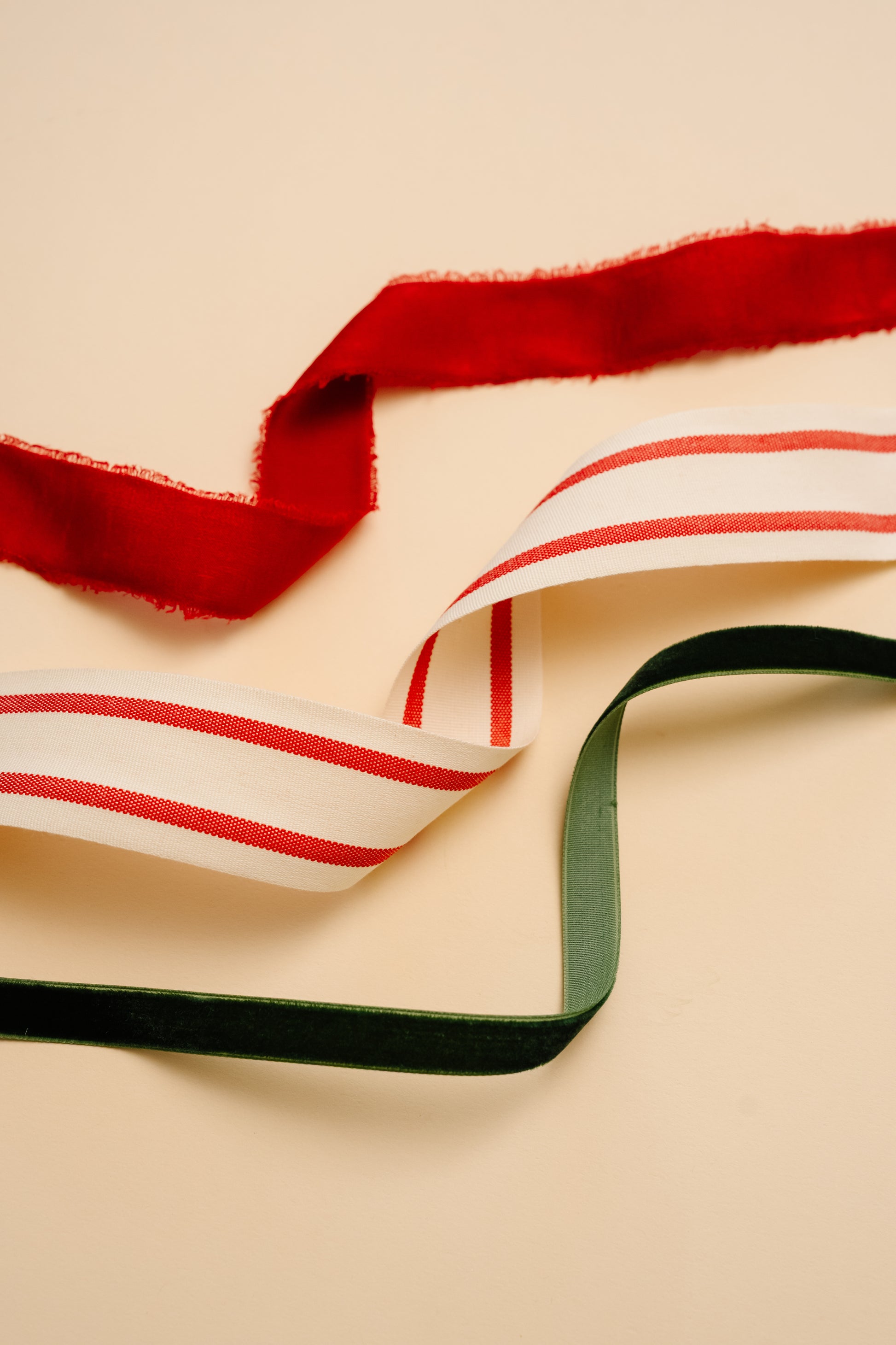 Ribbon: Includes 1.5” striped cotton, 1” red frayed velvet, and 1/2” green velvet. Each roll includes 20 yards, giving you plenty to tie up every gift beautifully.