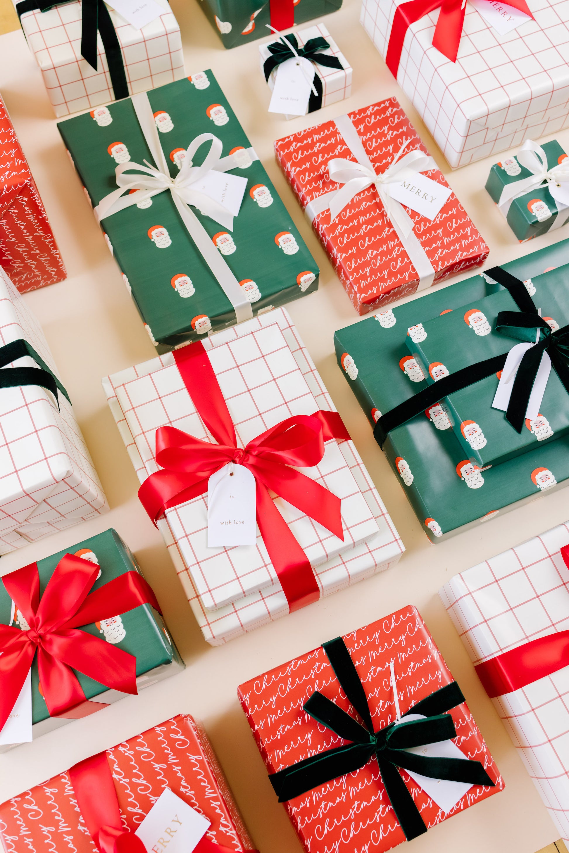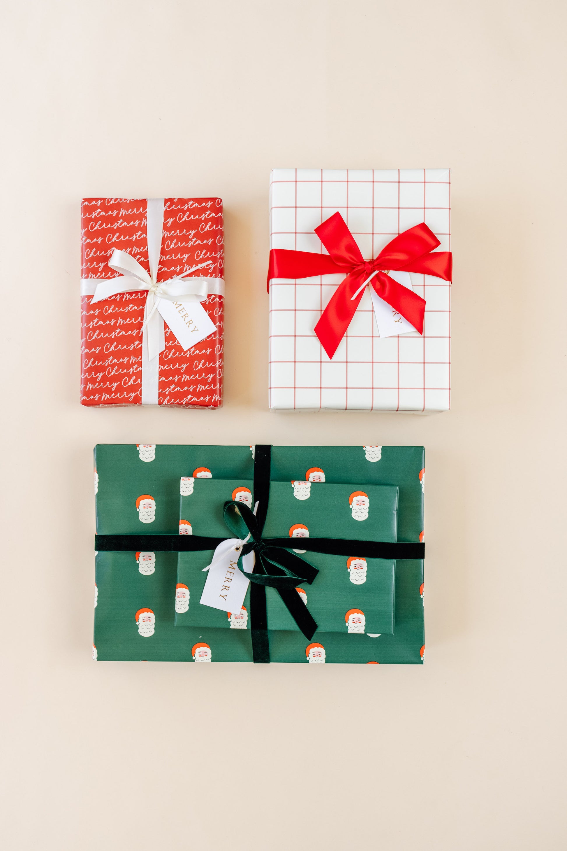 Wrapping Paper: santa pattern, cream and red grid and red merry christmas. All rolls are 30” x 14’ and printed on satin 80 gsm weight paper with grid lines on the back.
